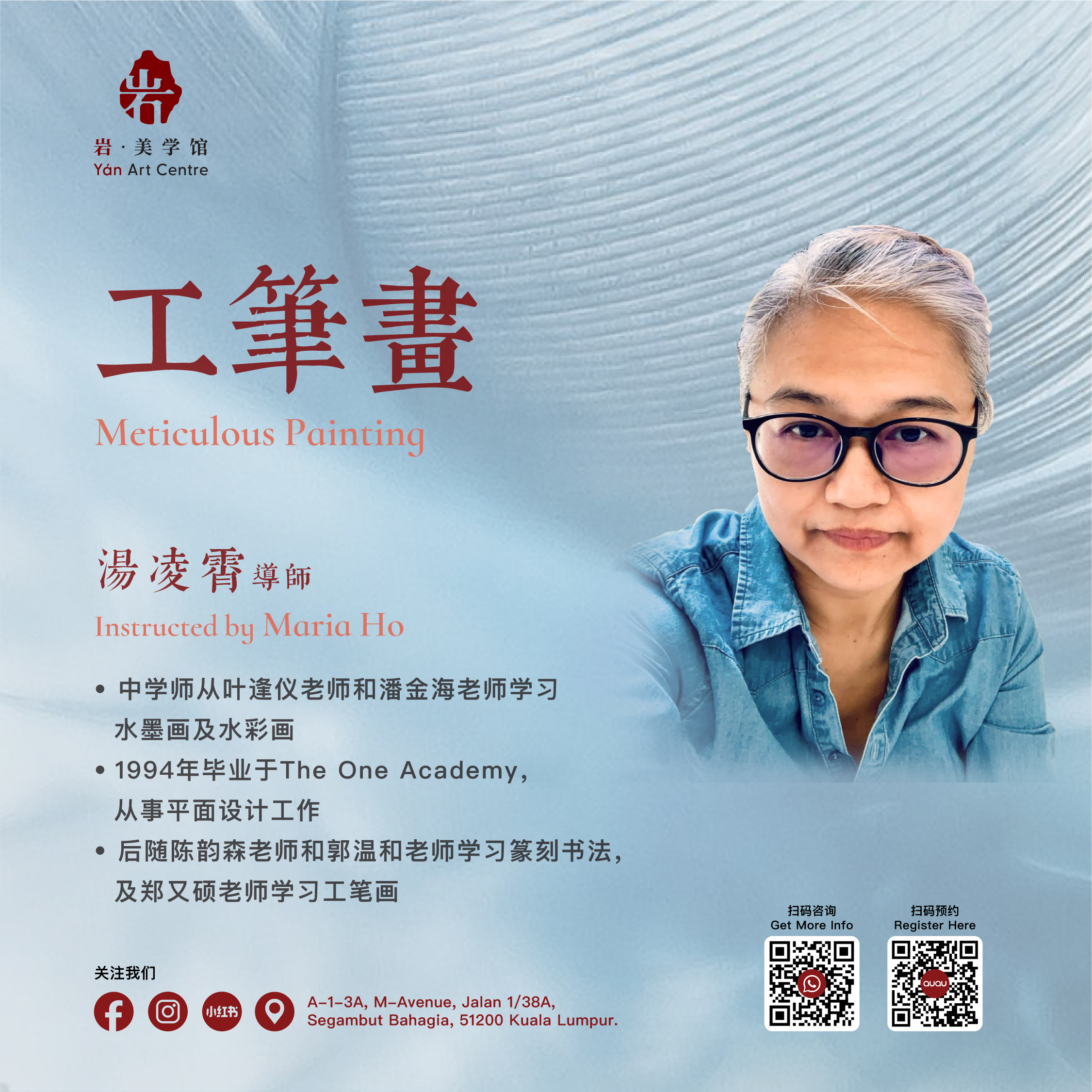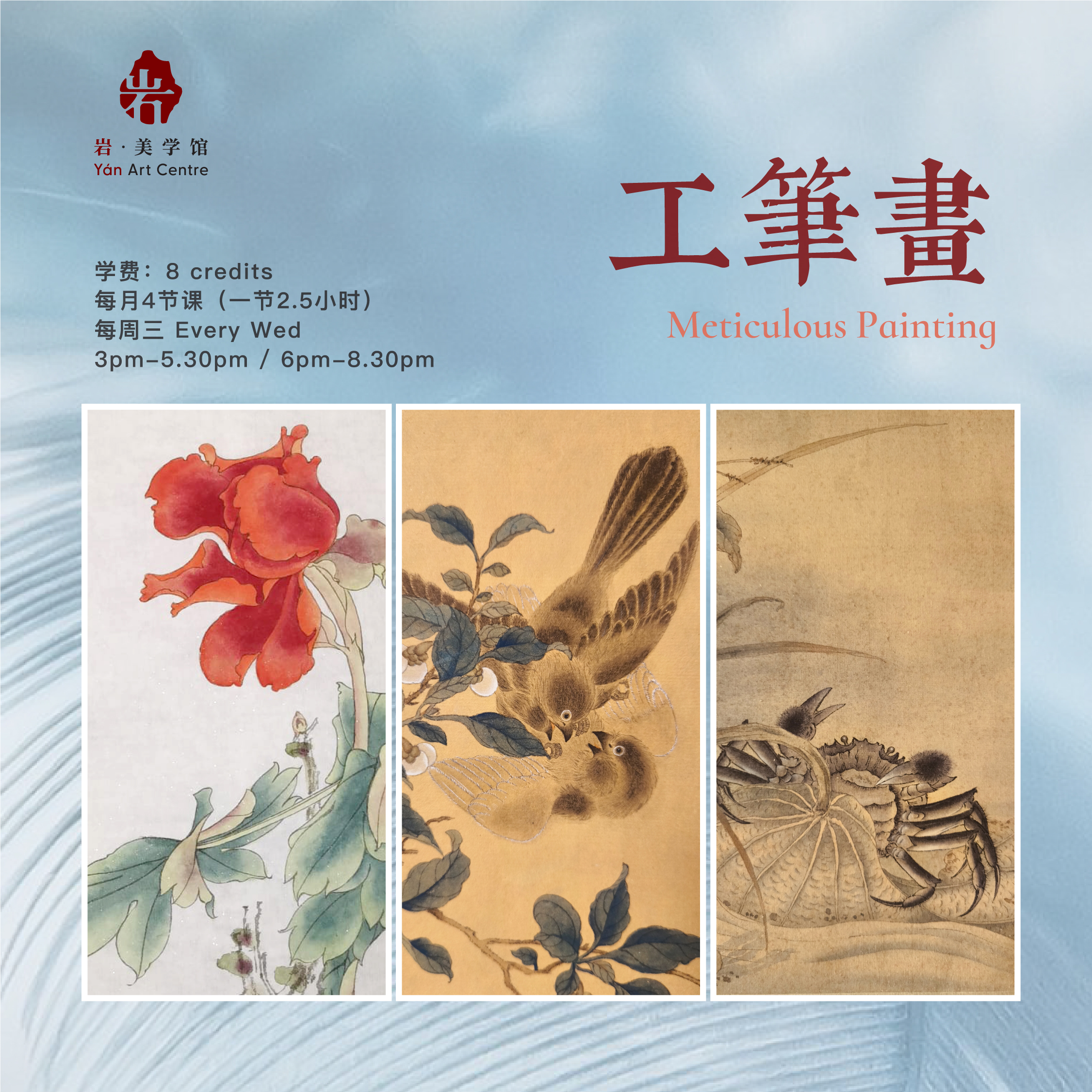 工笔画是中国画其中一项入门的绘画科目,讲究细节描绘,技法工整细致。初级课程学习包括媒介和画材介绍,临摹名家画作熟悉传统工笔画技巧;及自然观察与作品赏析。