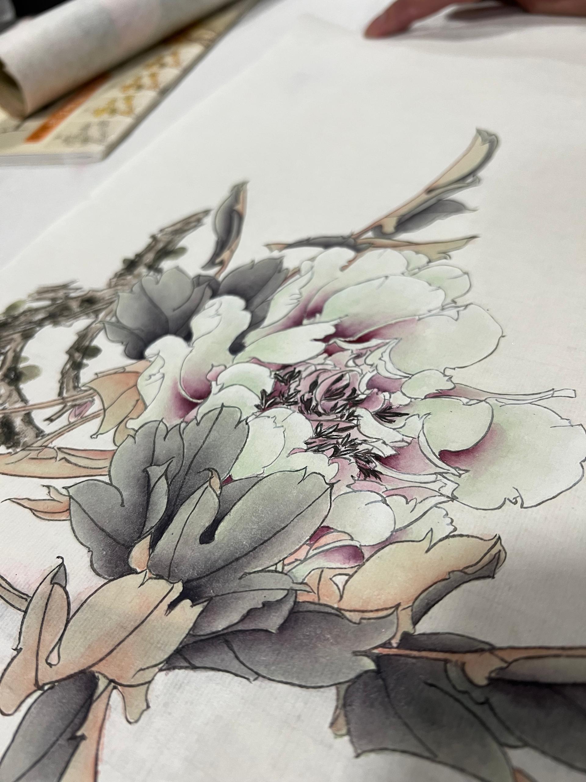 • 学习过程从摹拟名家画作开始,比如王道中牡丹,熟悉线条掌控和渲染手法,之后自行创作